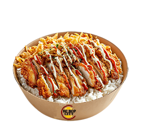 Riz sauce maison, poulet croustillant, sauce aigre douce, sauce sriracha piquante, oignons crispy, persil.